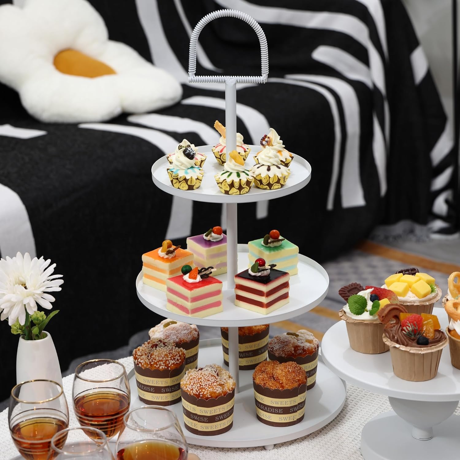 Size: 1*3-Tier Cupcake Rack: 8 inches, 10 inches, 12 inches * 20 inches(D*H) 1*Circle Display Table: 10 inches * 1.2 inches(D*H) 1*Round Cake Stand with Base: 10 inches * 5.5 inches(D*H) 2*Square Serving Plate: 8 inches *8 inches(L*W) 6*Spoon/6*Fork: 5.5 inches(L) 1*Knife:10.6 inches(L) 1*Spatula: 9 inches(L) Features: Material: Iron dessert stand, stainless steel tableware Main Color: White, Gold/Golden, Black, Pink Quantity: 17 pack cake serving set Multi-color: Cake stands are available in a variety of colors, always you can pick one that suits the theme of your party; Multifounction: As treat display table set, decoration home, dessert stand & gold trays for dessert table, rustic cake stands for wedding cakes, food stands for display, candy stand display for parties or festival gift; Perfect Combination: The cake stand and cutlery set make a perfect match, offering a complete and elegant table setting. Whether for weddings, birthday parties, or festive gatherings, this set will elevate the atmosphere with sophistication and style. 3-tier tower holder for cupcake, muffin, biscuit; serving tray for wine glass, dishes, mousse cake; cake pedestal and Display Table for cake, multi layer cake; Warmly Notice: The accessories in the picture is just for showing usage,do not included with the package; Cake stand Hand-crafted, welding can't be flawless; Please allow some dimensions difference, due to manual measurement; Please allow some color difference with product itself due to different monitor.