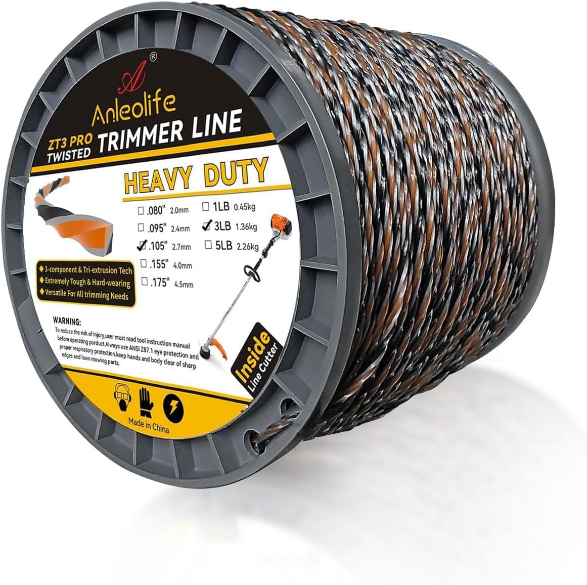 A ANLEOLIFE 3-Pound ZT3 Pro Heavy Duty Diamond .095-Inch-by-1122-ft Twisted Trimmer Line Spool,3-Component Tri-Extrusion 2.4-mm-by-342-meter Weed Eater String