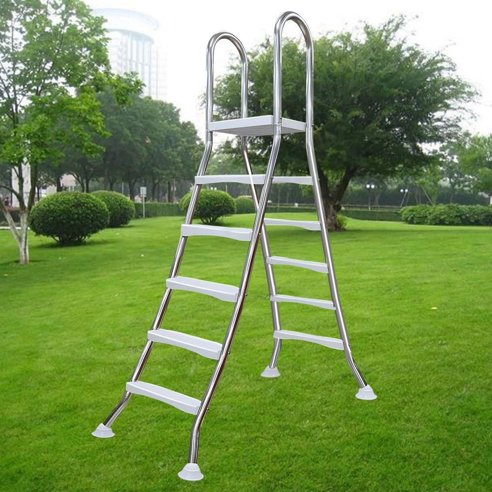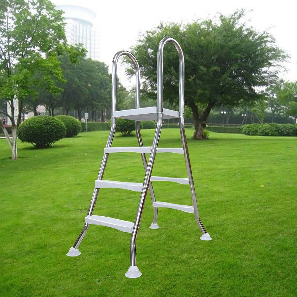 This pool ladder, designed for above-ground swimming pools, will help swimmers to get into and out of the pool. 1.This frame of the pool ladder is made from super strong 304 stainless Steel, The wall thickness is 1.1mm, and the diameter of the steel pipe is 1.65" /(42mm), which is stronger and more stable.The load-bearing capacity is more than 550 pounds. 2. Two non-skid stairs on each side are made of heavy duty plastic, increasing friction and protecting you from slipping. 3. The tall handrails give you steady support climbing in and out, while the included platform offers a convenient pause point. 4. This pool ladder is designed to fit all above-ground standard pools. 5. Package Includes: 1 x Pool Ladder / 1 x User Guide. You will have more time swimming in your pool via our pools ladder above ground pool this summer. 2+2 steps: Escalator height 55.5 inches / 1.41m, suitable for bracket lacquered pools of 33 inches / 0.85m and below. 2 steps Ladder each side.about 30 lbs (13.5 kg). 3+3 steps: Escalator height 65 inches / 1.65m, suitable for bracket lacquered pools of 43 inches / 1.1m and below.3 steps Ladder each side.about 35 lbs (16 kg) 4+4 steps: Escalator height 72.8 inches / 1.85m, suitable for bracket lacquered pools of 53 inches / 1.35m and below.4 steps Ladder each side.about 42 lbs (19 kg). 5+5 steps: Escalator height 82.7 inches / 2.1m, suitable for bracket lacquered pools of 63 inches / 1.6m and below.5 steps Ladder each side.about 49 lbs (22 kg). LADDER FEATURES LADDER SIZE