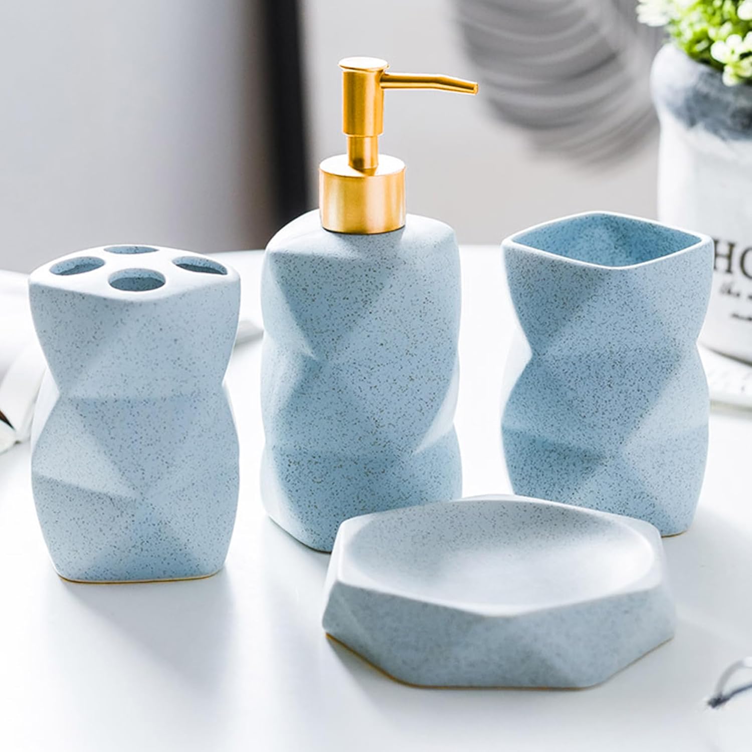 Practical 4-Piece Bathroom Set:This complete bathroom accessory set includes everything you need: 1 soap dispenser, 1 toothbrush holder, 1 tumbler, and 1 soap dish. Made from high-quality ceramic material, each piece is durable and designed for daily use. Say goodbye to clutter and enjoy a tidy sink area with this practical 4-piece set that covers all your bathroom organization needs