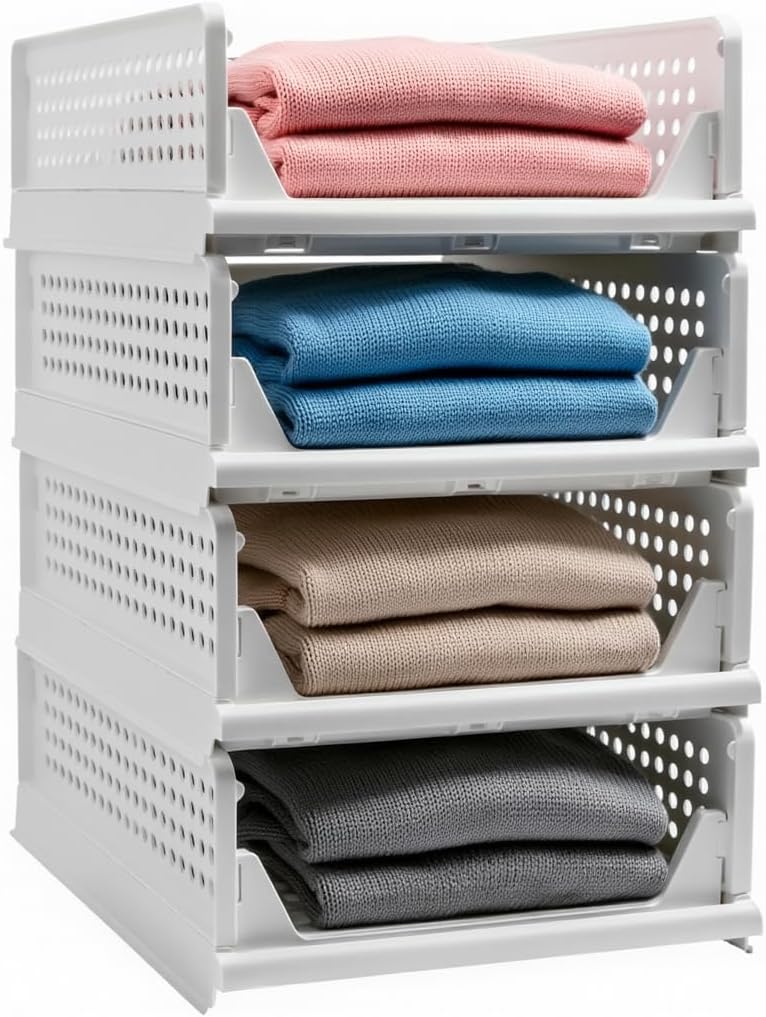 Goderewild Stackable Foldable Storage Baskets, Folding Storage Bins, Closet Organizers and Plastic Drawer Shelf Storage Container for Wardrobe, Cupboard, Kitchen, Bathroom, Office (White, 4L)
