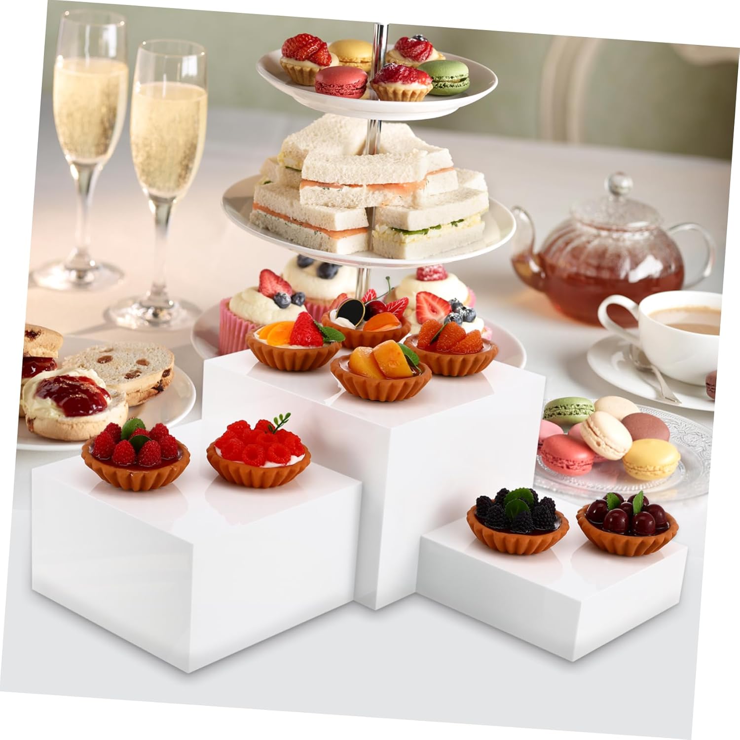 Package Include 1 riser small 1 riser medium 1 riser large Features - Space-saving display: Easy to store and stack, these dessert risers help you maximize your space when not in use while enhancing your tabletop display cake riser - Versatile use: These cube display stands are ideal for elevating food at buffet tables, displaying figures or jewelry pieces, and organizing perfumes or other small items buffet food risers - Sturdy and stable: These buffet risers made of acrylic are built to support a variety of items securely and stand on table stably, giving people peace of mind display risers - Simple and elegant: The minimalist cube risers complement any decor, making them suitable for a variety of settings, from casual buffets to formal events food display holder -Color:White tiered serving stand -Material:Acrylic cupcake display risers -Size: 15.50X15.50X5.50cm/6.09X6.09X2.16in 20.50X20.50X15.50cm/8.06X8.06X6.09in 18.00X18.00X10.50cm/7.07X7.07X4.13in serving risers for food - Easy to clean: The smooth surfaces of these display risers make them easy to wipe down and maintain, keeping them stay for every use dessert risersGoods Descriptioncupcake holders These simple, cube -shaped risers are designed to elevate your presentation, whether you're hosting a buffet, showcasing collections, or organizing your vanity.food display risers Crafted for both functionality and aesthetics, they are ideal for any place.buffet stand risers Introduce our versatile food risers for buffet table, which can also double as elegant figure display stands or perfume stands