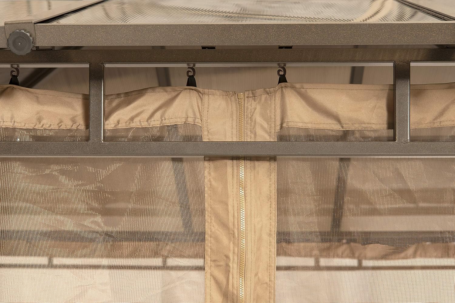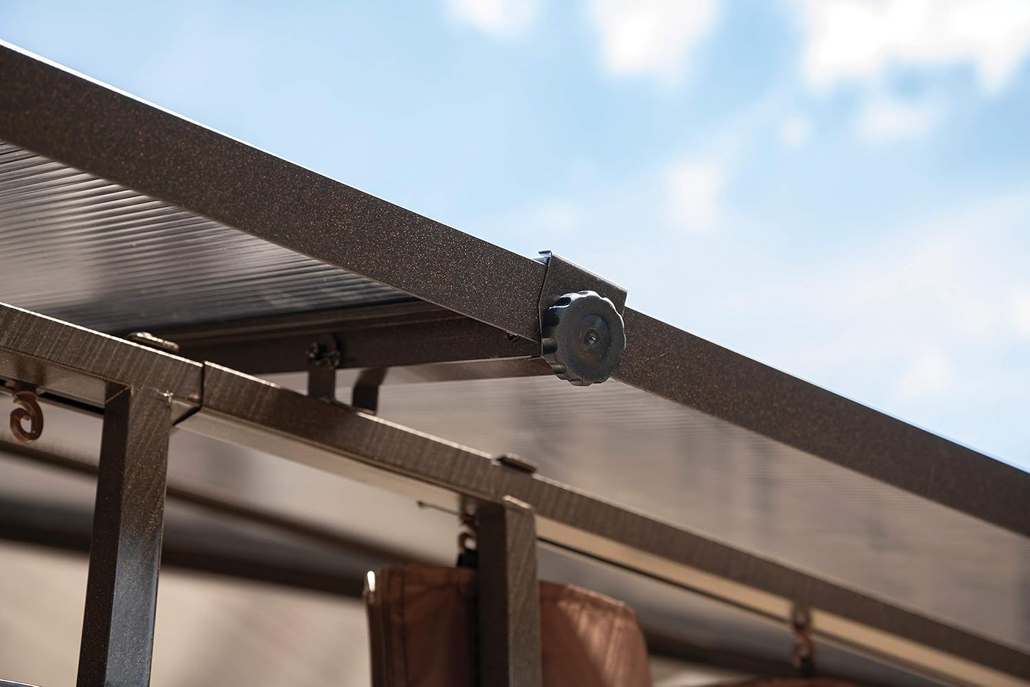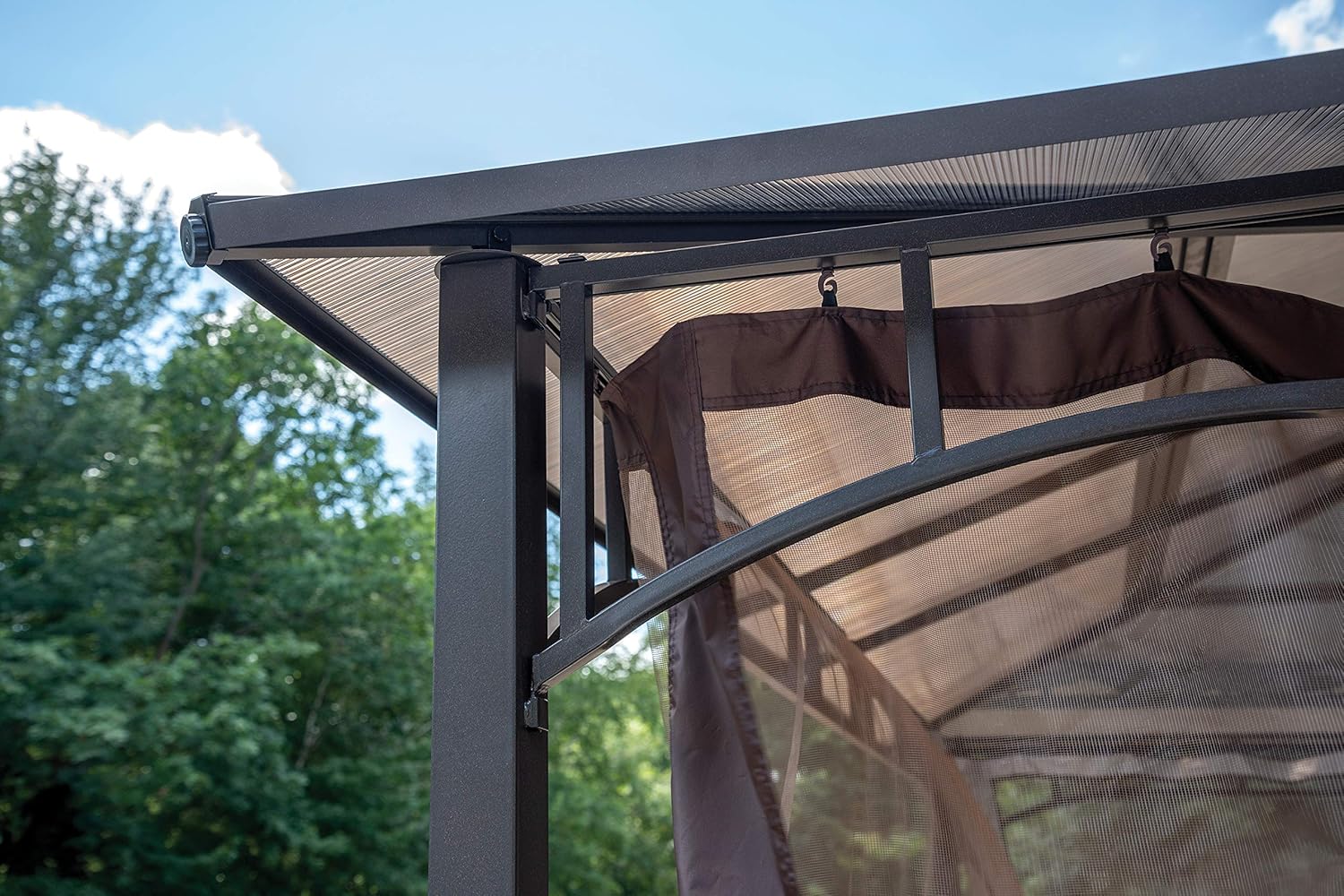 A great alternative to traditional gazebos, the freestanding Sycamore Gazebo from ShelterLogic is a versatile solution for virtually any deck or backyard. The shade structure is made of durable and tough premium powder-coated steel that resists chipping, peeling, rust and corrosion. For added durability and security, the strong steel frame boasts 2.5" x 2.5" square tube legs and .9" square steel truss supports, which help provide a solid and sturdy gazebo frame. The sun shelter includes a tough polycarbonate hardtop roof that protects against harmful UVA and UVB rays to help keep you and your family protected and shaded. The included mosquito nets are CPAI-84 fire-rated and certified and provide natural lighting to your enclosed patio while protecting you from pesky outdoor bugs. The mosquito netting zips together to convert your gazebo into a screenhouse instantly, or use the included ties to convert them to attractive valances. It also creates an intimate and luxurious space that shelters you and your loved ones from the sometimes harsh and unpredictable elements. Enjoy outdoor entertaining in your sunroom while staying cool and dry. Keep your outdoor furniture, grill, and other outdoor items stored and dry when the weather gets rough. The Sycamore gazebo provides 120 sq. ft. of outdoor entertaining space. This freestanding shade structure will last you for years, adding an elegant outdoor living space and a pleasing aesthetic to backyards, decks, patios, gardens, and much more. Assembly is required and 3 people are recommended for assembly. The ShelterLogic Sycamore Outdoor Gazebo exterior measures 106.3" W x 145.67" D x 102.36" H. The gazebo kit includes a 1 year limited warranty. Purchase includes: Frame, Polycarbonate Top, Mosquito Netting, Temporary Anchors