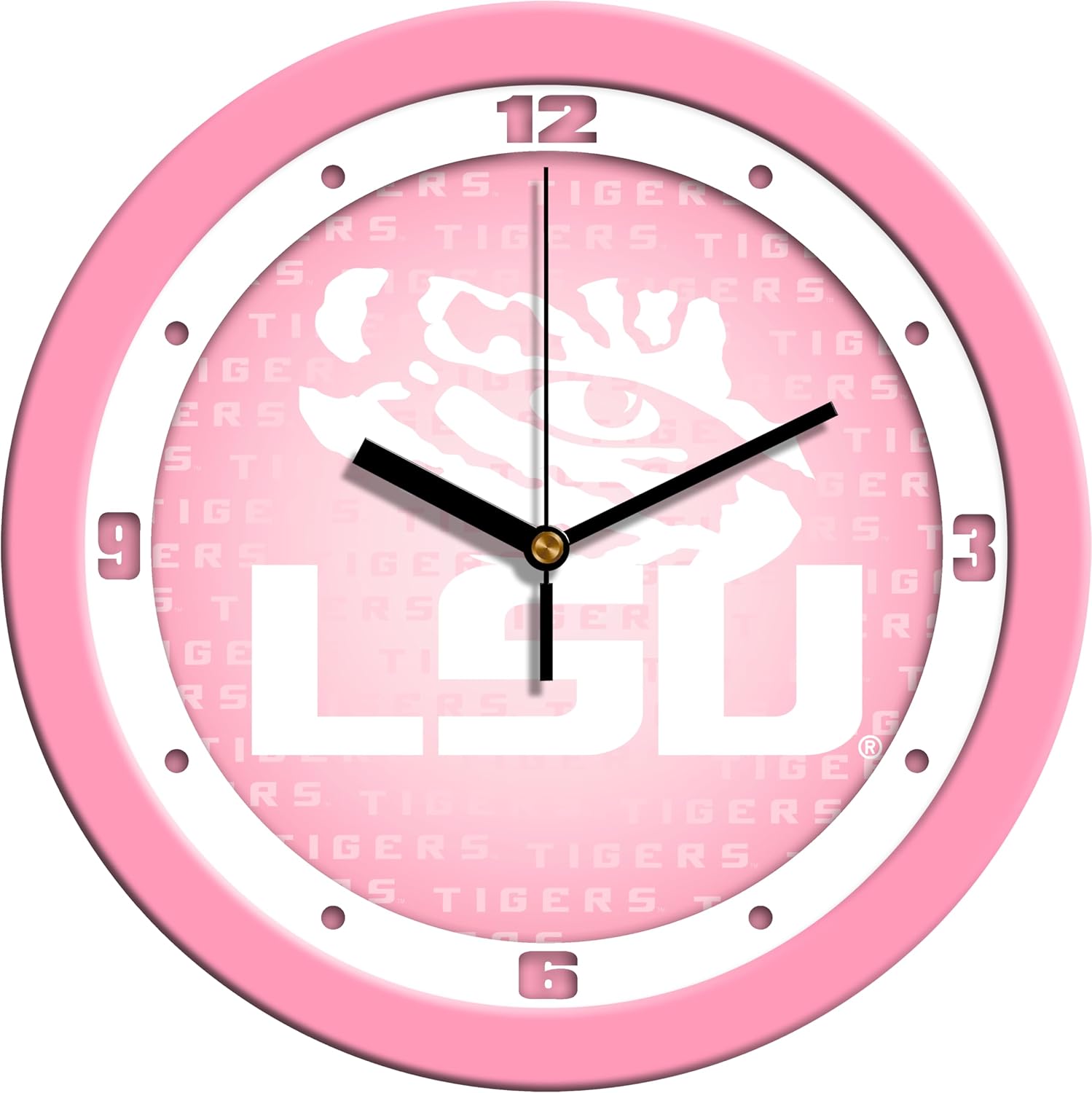 Demonstrate your team spirit in your home or office with sun times collegiate wall clock. These 11.5 inch stylish wall clocks feature a battery-powered quartz accurate movement. Unlike plastic wall clocks, you experience superior visibility with our mineral glass crystal. The printed ring on the crystal displays the numbers with a school color-coordinated outer bezel that looks great. Sun times wall clocks are made out of the highest quality materials and are the perfect choice for any college sports fan. Clock measures: 11.5" x 11.5".