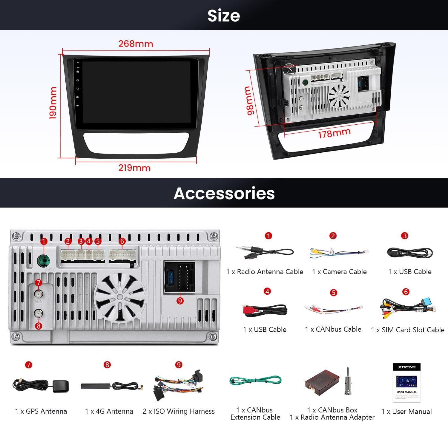 Applicable Models&Years For Mercedes-Benz E-Class W211 (E200 / E220 / E240 / E270 / E280) (2002-2008) CLS Class W219 (CLS-350/CLS-500/CLS-55) (2005-2006) Features ※ 9” High Definition Screen 1280*720 with 9 inch high definition screen. Upgrades your driving experience with supersized entertainment ※ IPS Panel, 178°Viewing Angle Enjoy viewing on a big screen stereo without eye fatigue or discomfort from any angle. ※ Built-in DSP Take your audio experience to a new level and rekindle your hearing experience. ※ Smartphone Connectivity Support Wireless and Wired CarPlay and Android Auto; Bluetooth 5.0 Connection for calls and voice control. ※ Optimized CANbus Decoding Make features work perfectly after upgrading. The functions include control, reversing control and more. ※ Picture in Picture You can keep a consistent video watching experience while using the car stereo for browsing info online or navigating to other apps. Optional Accessories: Need OBD Function? Please search ASIN: B015MU8UN6 / B08HQ9LQ9X Need TPMS Function? Please search ASIN: B07WQFKV5G / B07DKB4GD2 Need Front / Reversing Camera? Please search ASIN: B07HMLYLJJ / B00GY3BVT6 Need External DVR? Please search ASIN: B07MBYCG4C / B08MF1ZRJ3 Accessories: 1 × Radio Antenna Cable 1 × Camera Cable 2 × USB Cable 1 × CANbus Cable 1 x SIM Card Slot Cable 2 × ISO Wiring Harness 1 × 4G Antenna 1 × GPS Antenna 1 × CANbus Box 1 × Radio Antenna Adapter 1 × CANbus Extension Cable 1 × User Manual